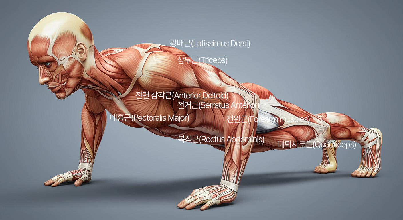 팔굽혀펴기는 여러 근육을 동시에 단련합니다. 주요 타겟은 다음과 같습니다: