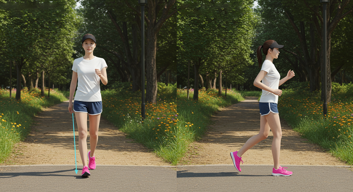 허리를 곧게 펴고 발바닥 전체로 착지하는 습관을 들입니다.