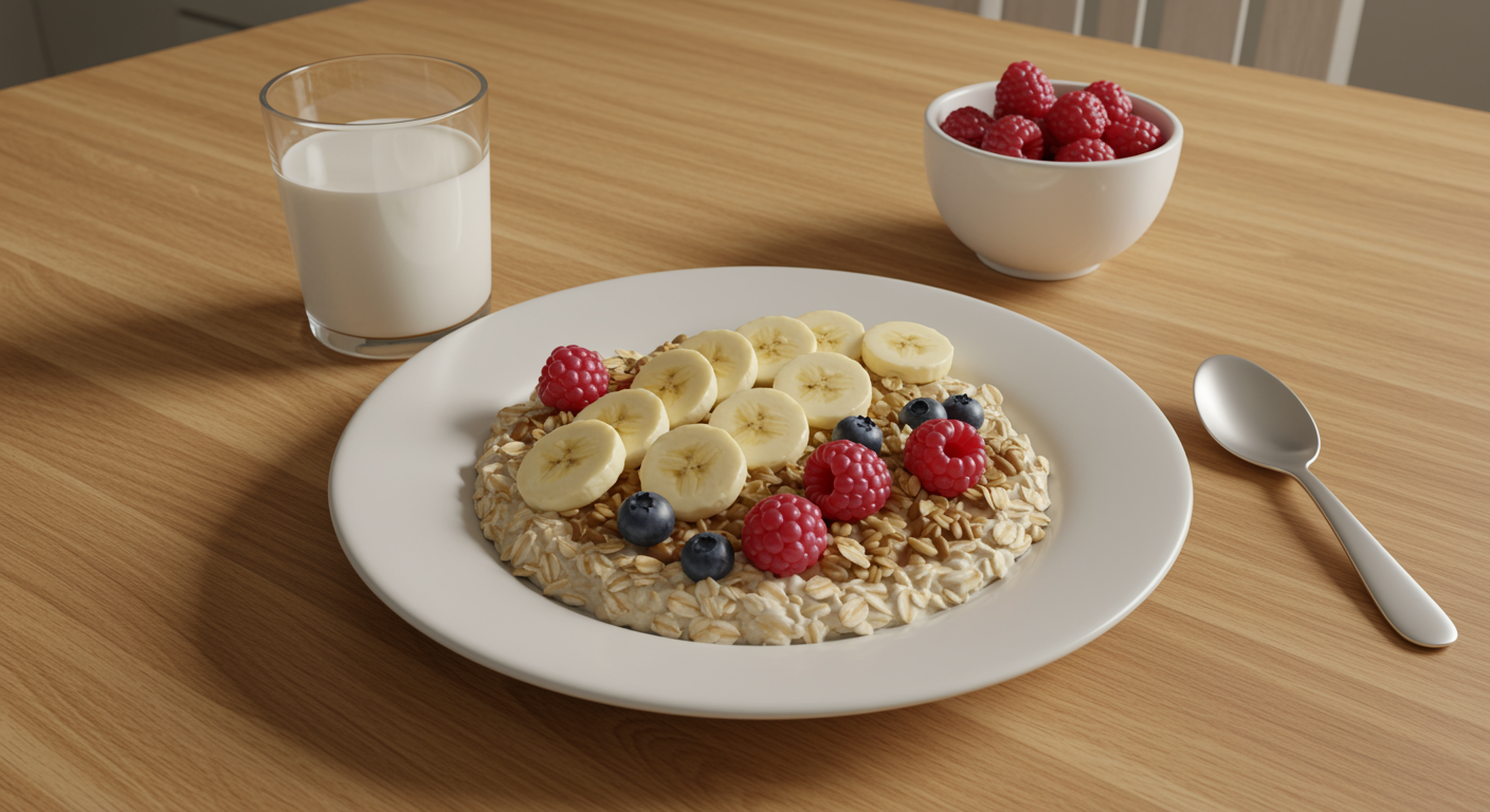 오트밀 50g에 저지방 우유 200ml, 바나나 반 개를 곁들입니다. 총 칼로리는 약 300kcal로, 포만감이 높아 배고프지 않습니다.
