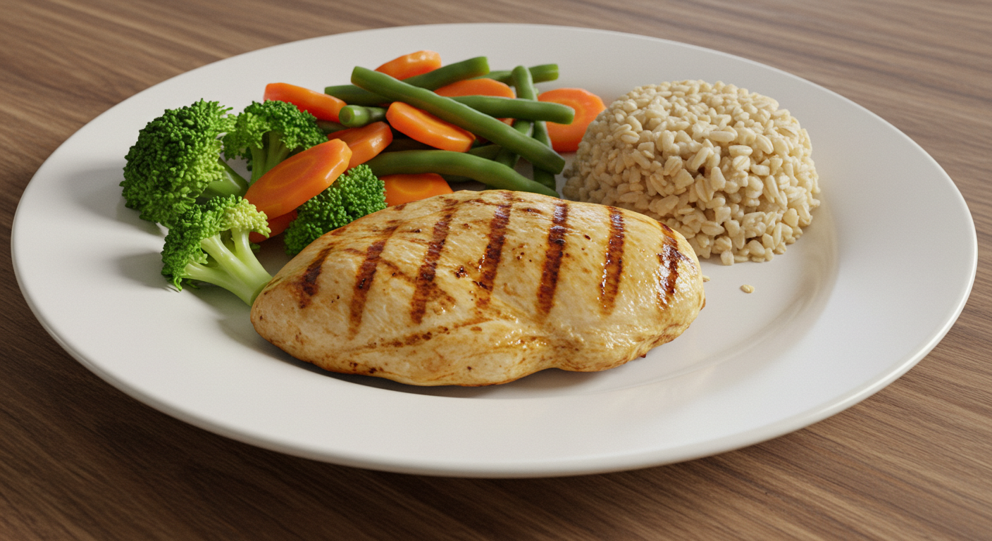 닭가슴살 100g, 브로콜리 찜 100g, 귀리밥 50g으로 약 400kcal입니다. 단백질과 식이섬유가 풍부해 포만감을 유지합니다.