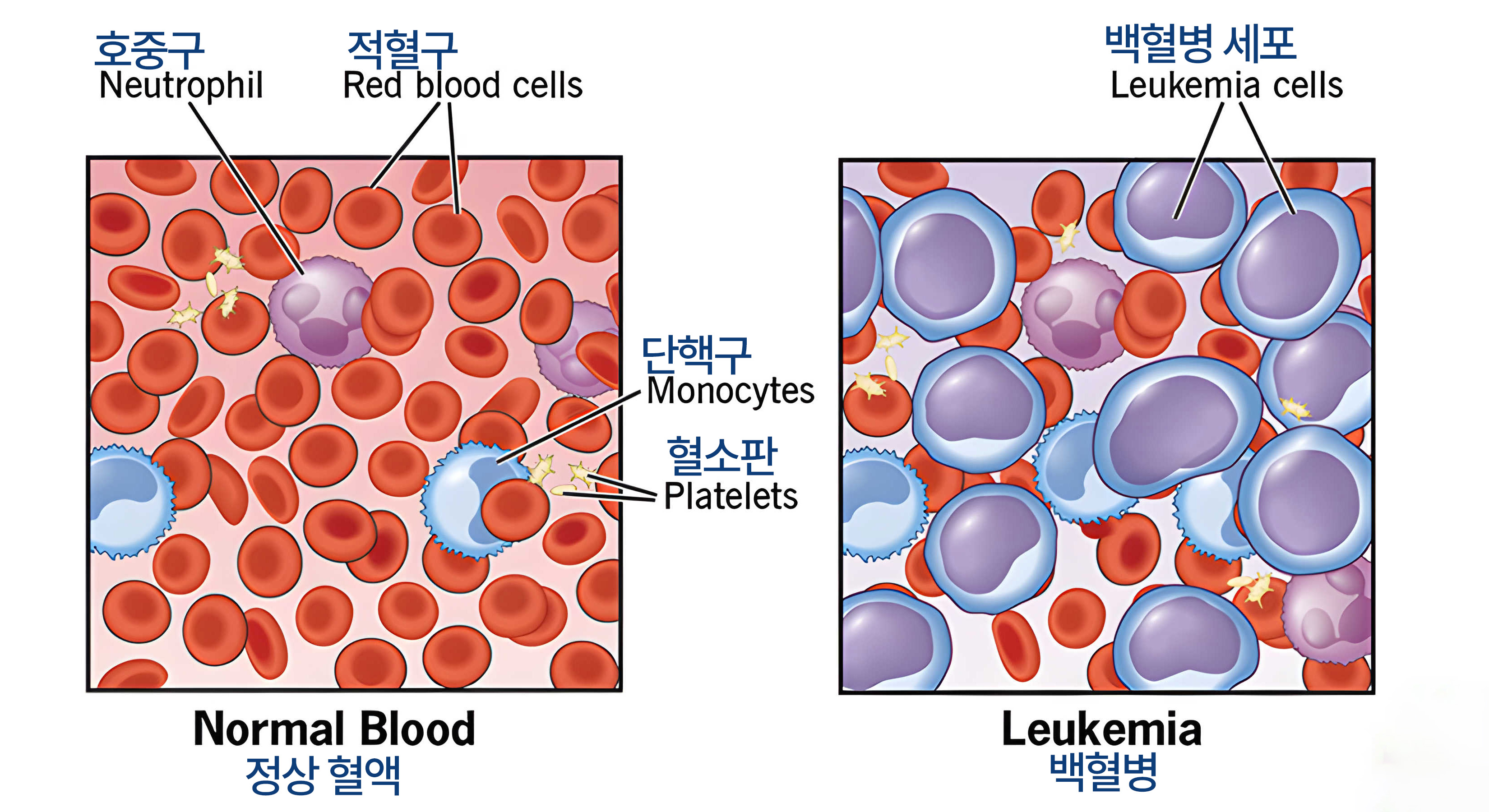 백혈구 수치의 비정상적 증가나 감소는 백혈병(Leukemia)이나 림프종을 의심하게 합니다. 이는 조직 검사 없이 혈액검사만으로도 초기 진단이 가능합니다.
