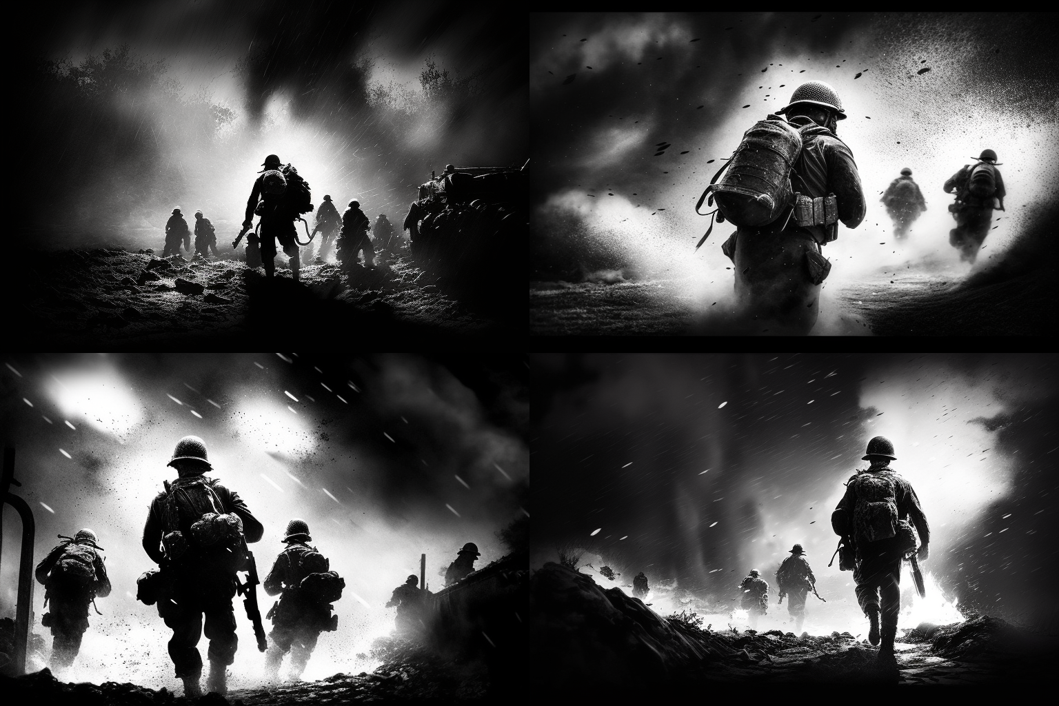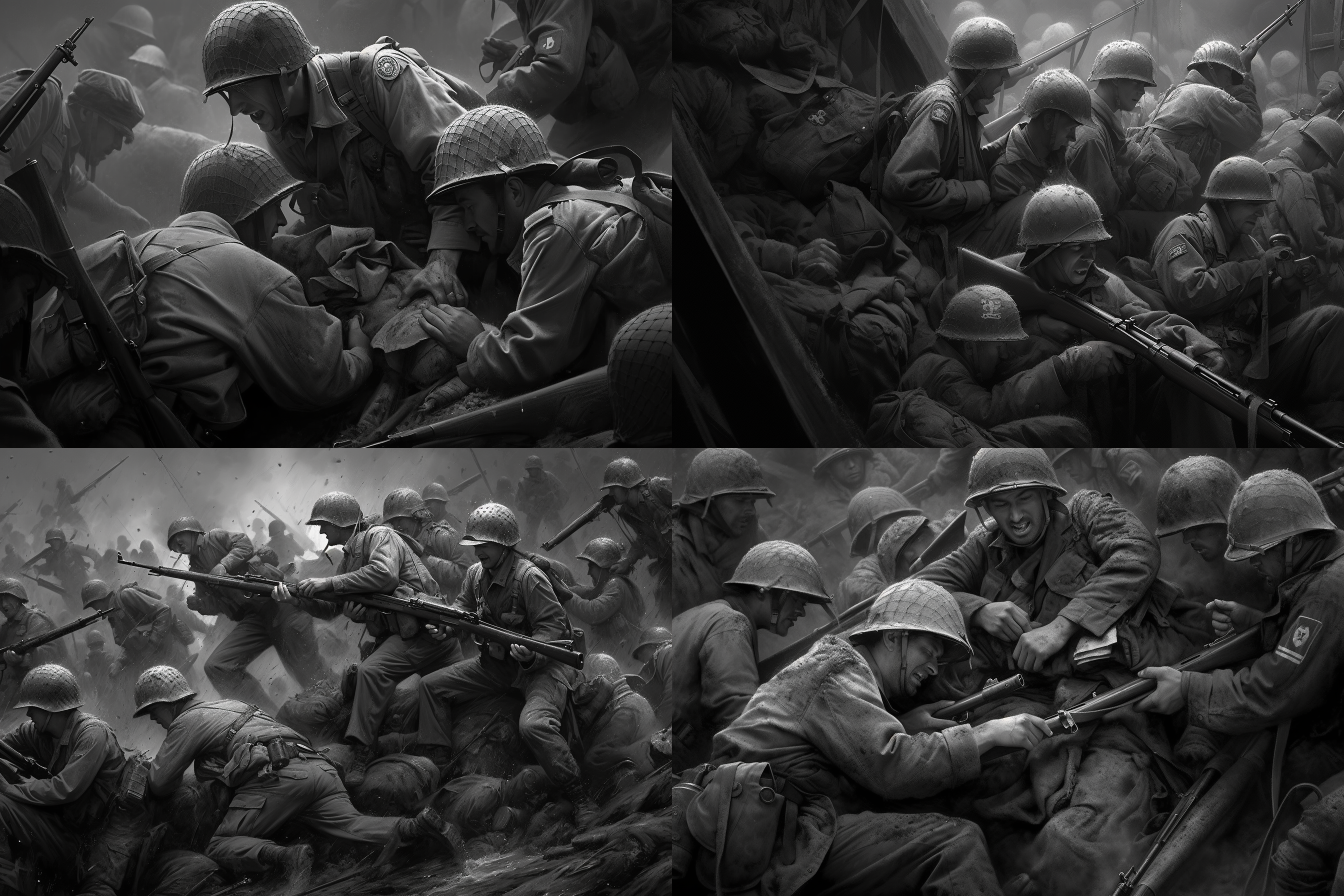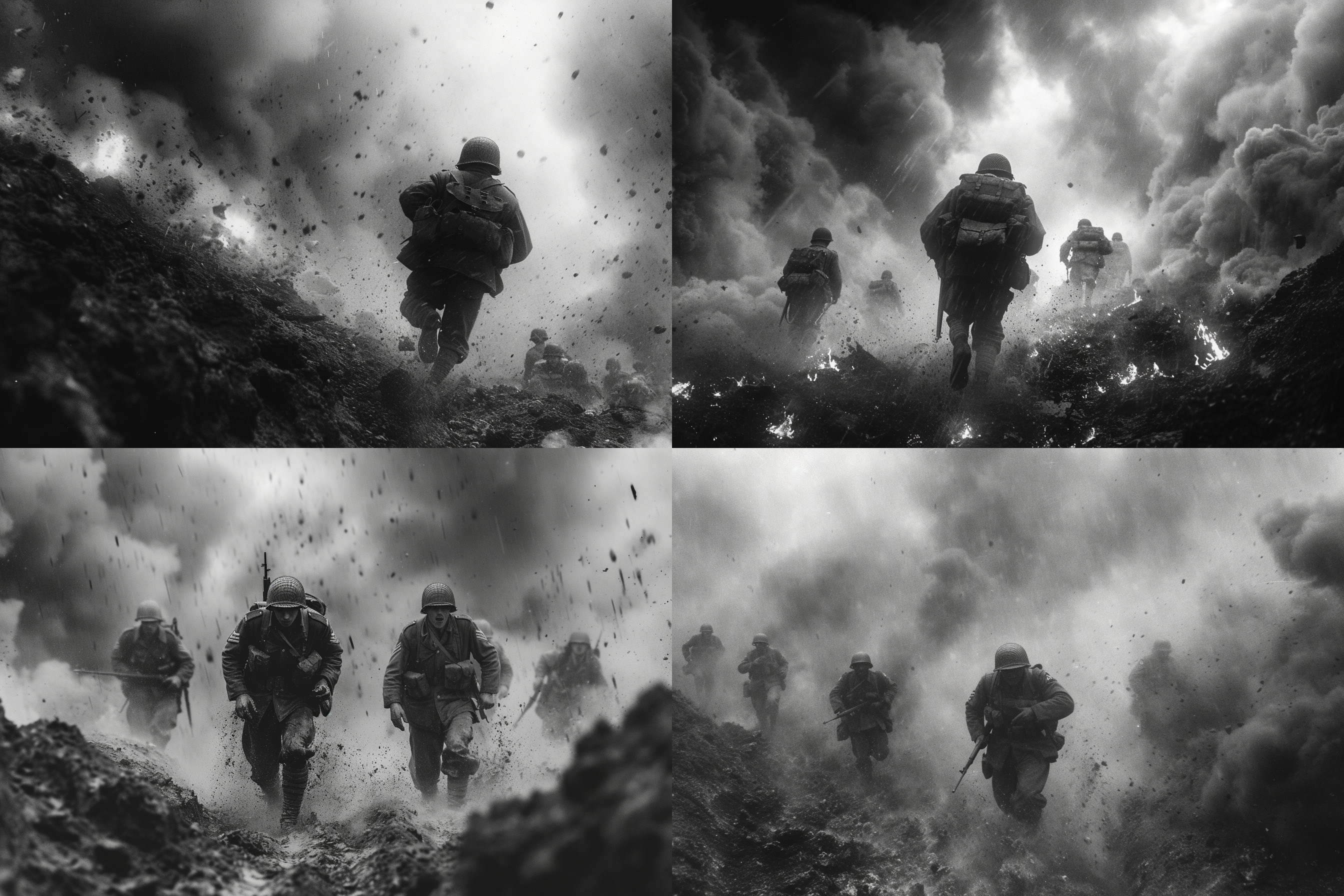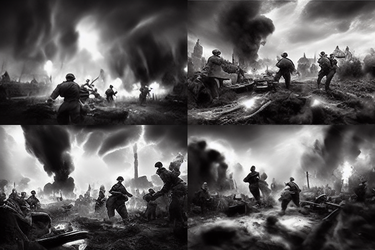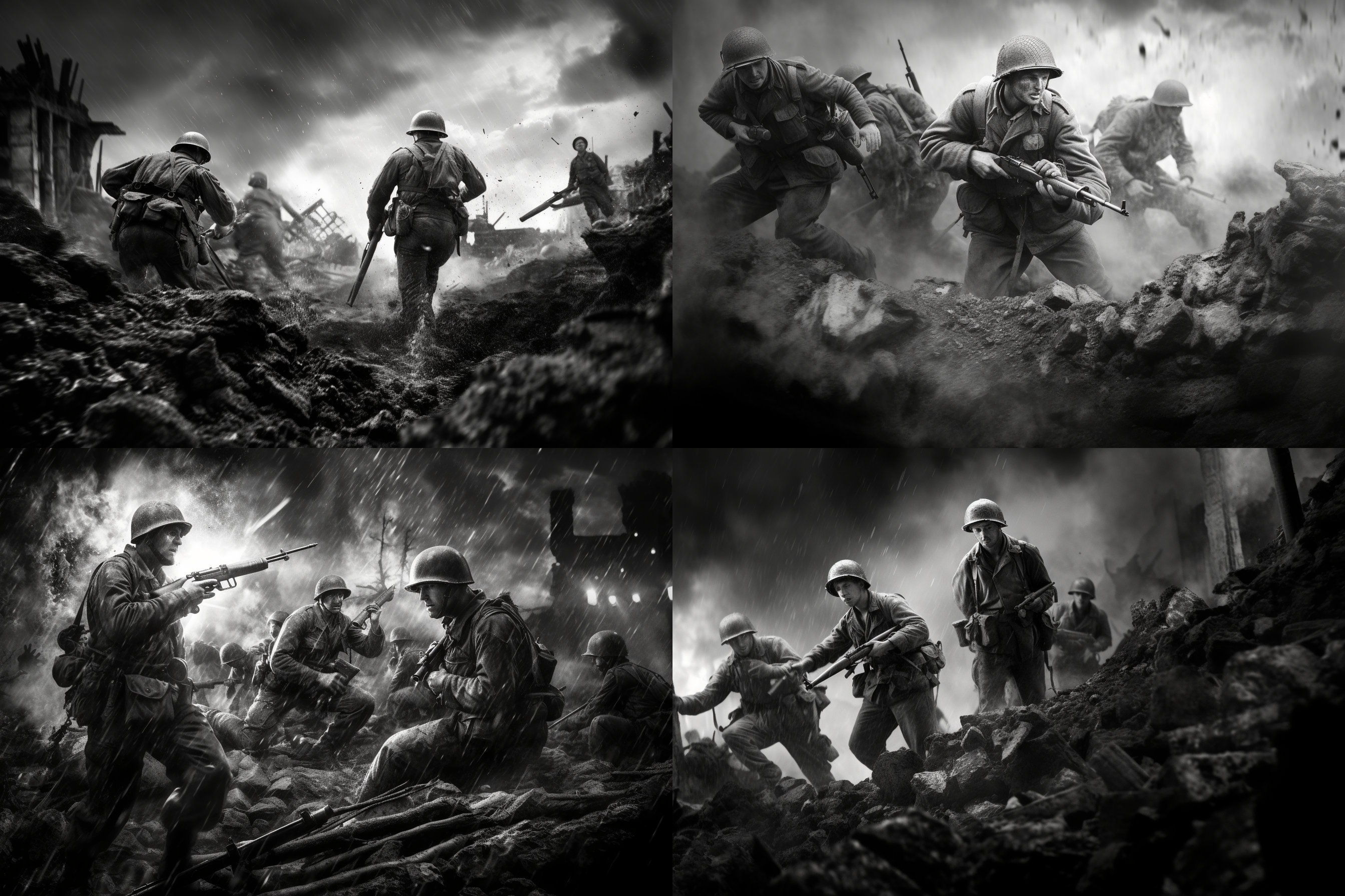제2차 세계대전에서 가장 치열했던 전장, 격렬한 전투를 벌이는 병사들, 폭발과 혼돈, 역사적 정확성, 드라마틱한 조명, 고해상도, 진정성을 위한 흑백 이미지를 뽑아 달라고 주문 했습니다.