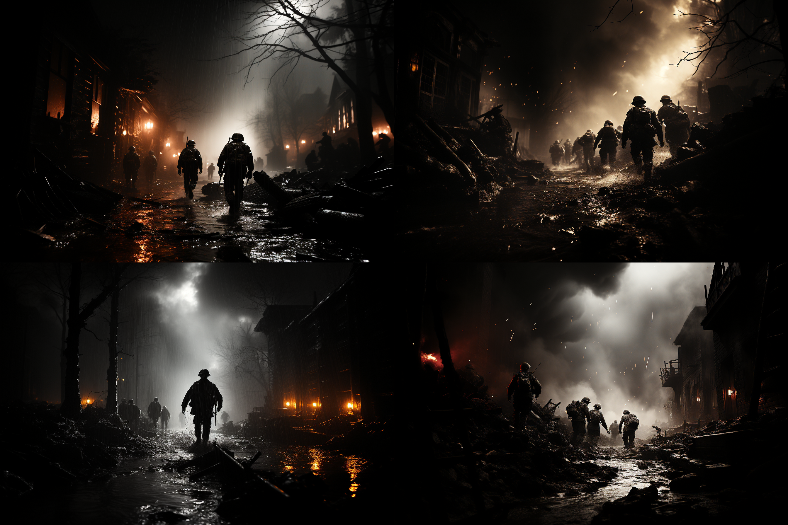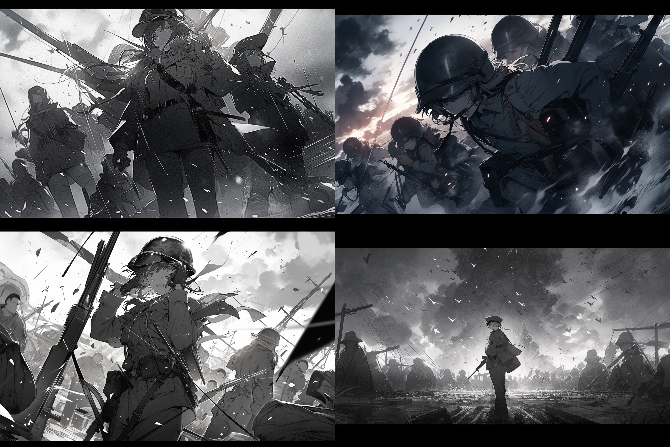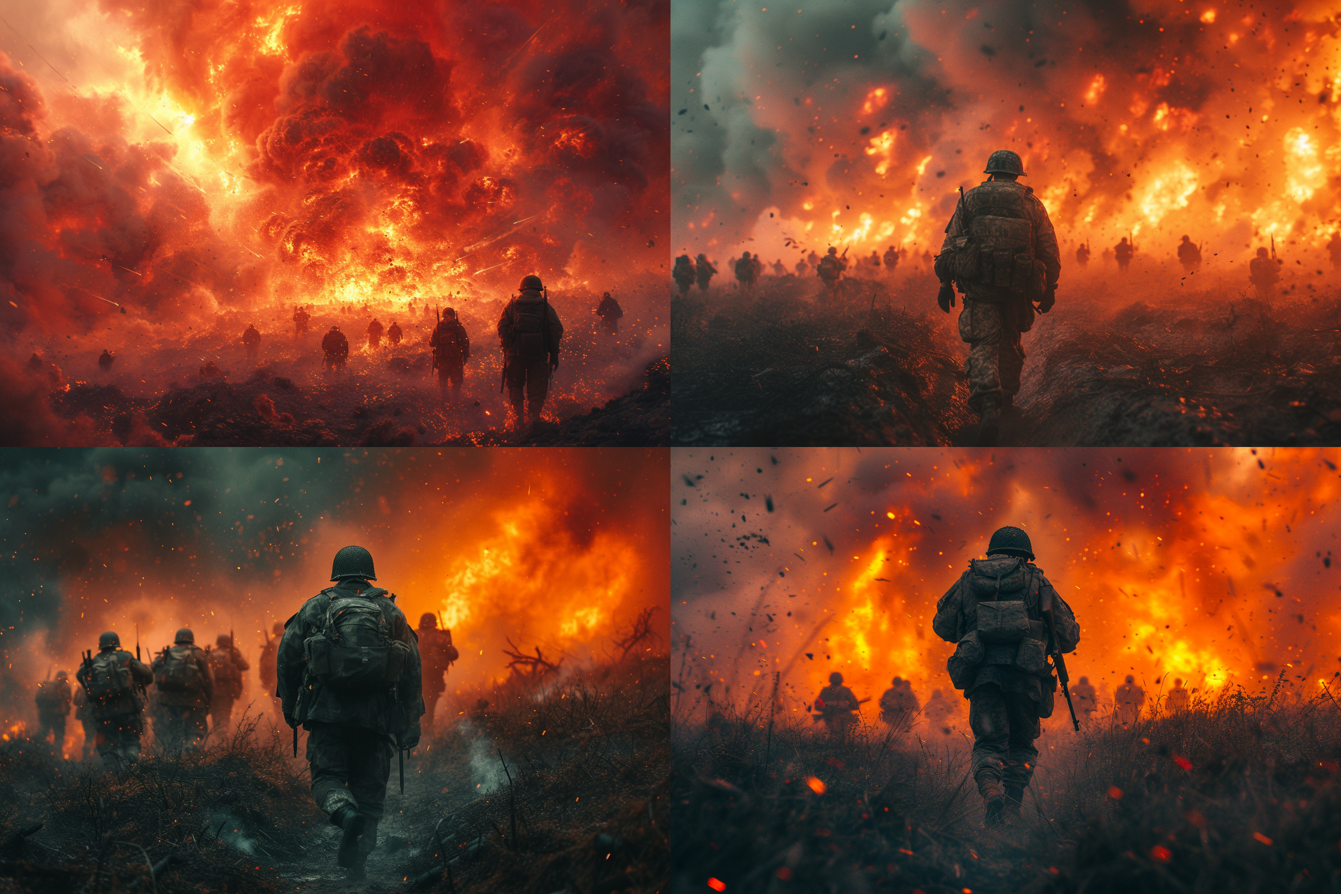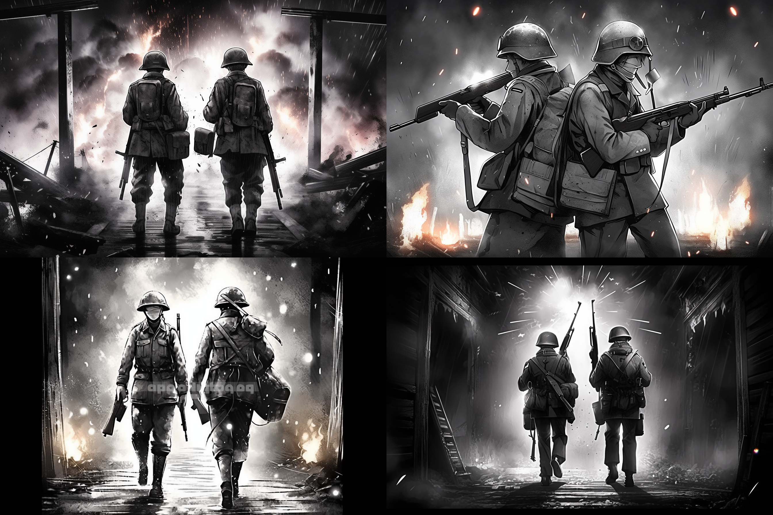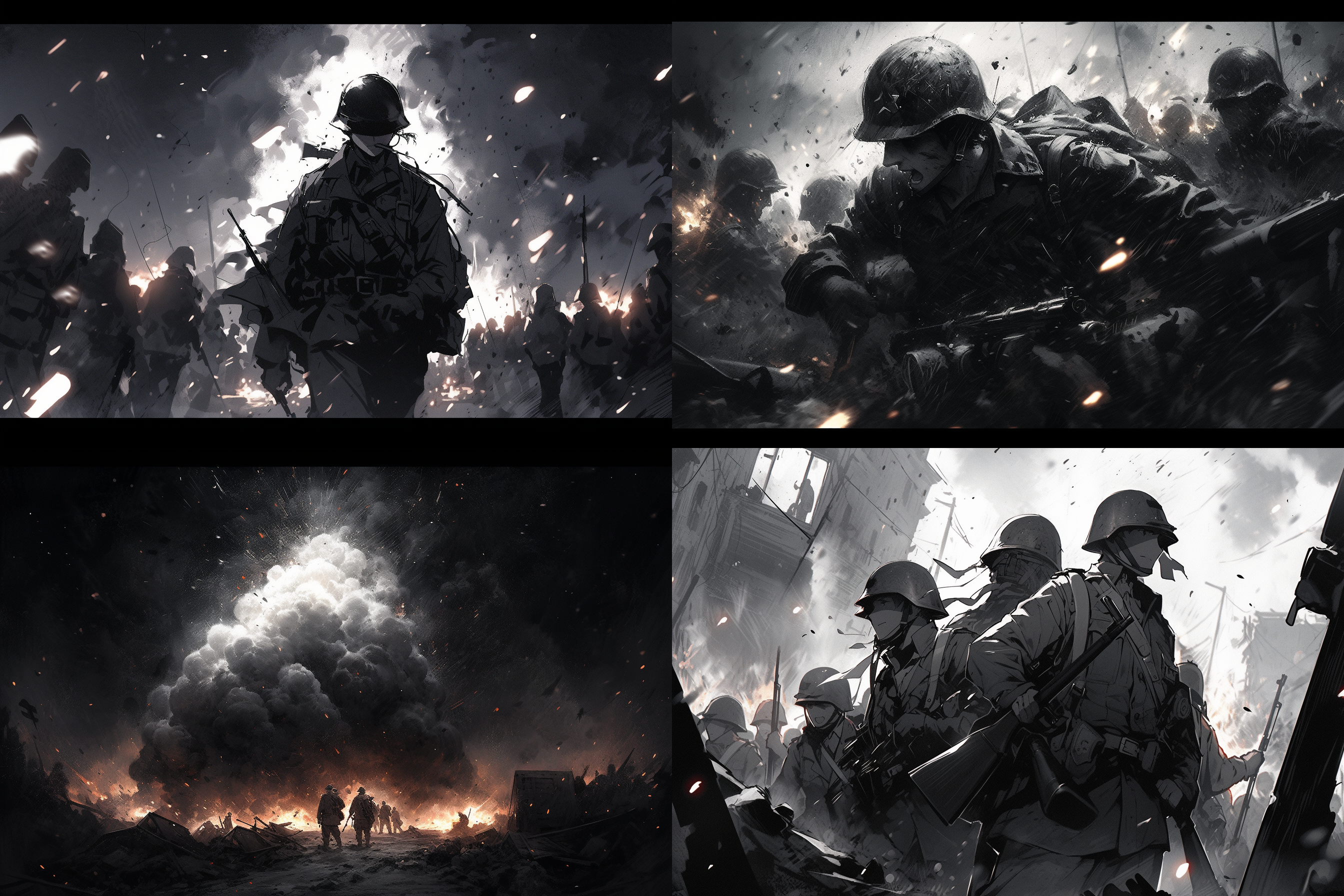 제2차 세계대전에서 가장 치열했던 전장, 격렬한 전투를 벌이는 병사들, 폭발과 혼돈, 역사적 정확성, 드라마틱한 조명, 고해상도, 진정성을 위한 흑백 이미지를 뽑아 달라고 주문 했습니다.