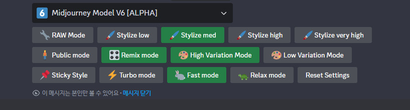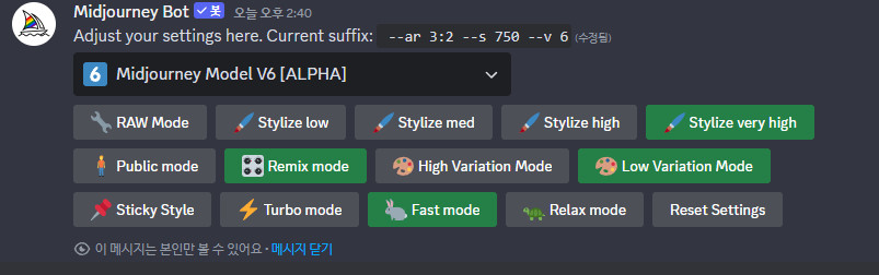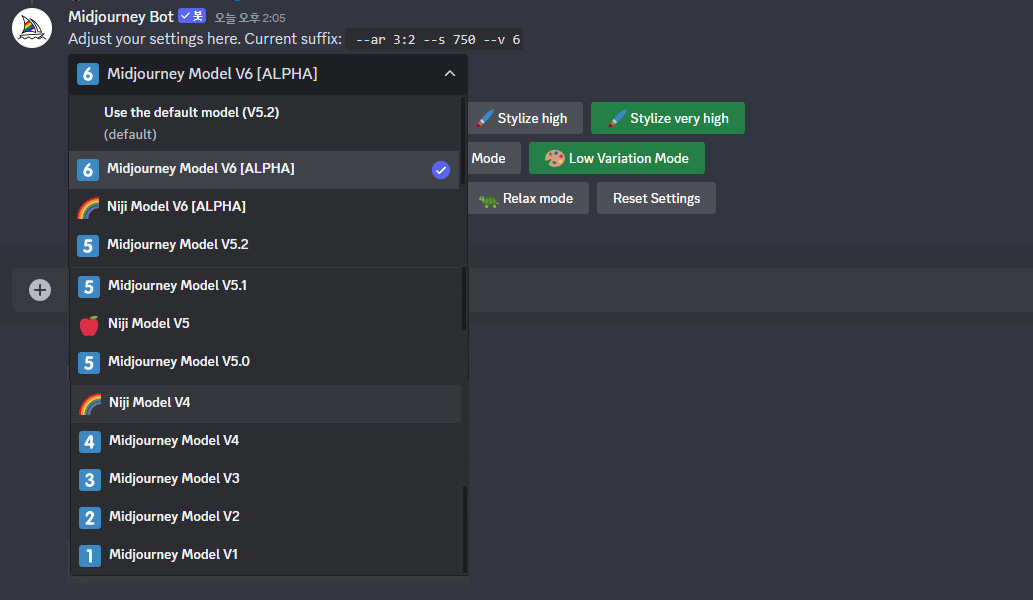 Dicord 내의 Midjourney는 슬래쉬 셋팅 (/settings)를 입력후 엔터를 치면 버젼별로 조절이 가능합니다.