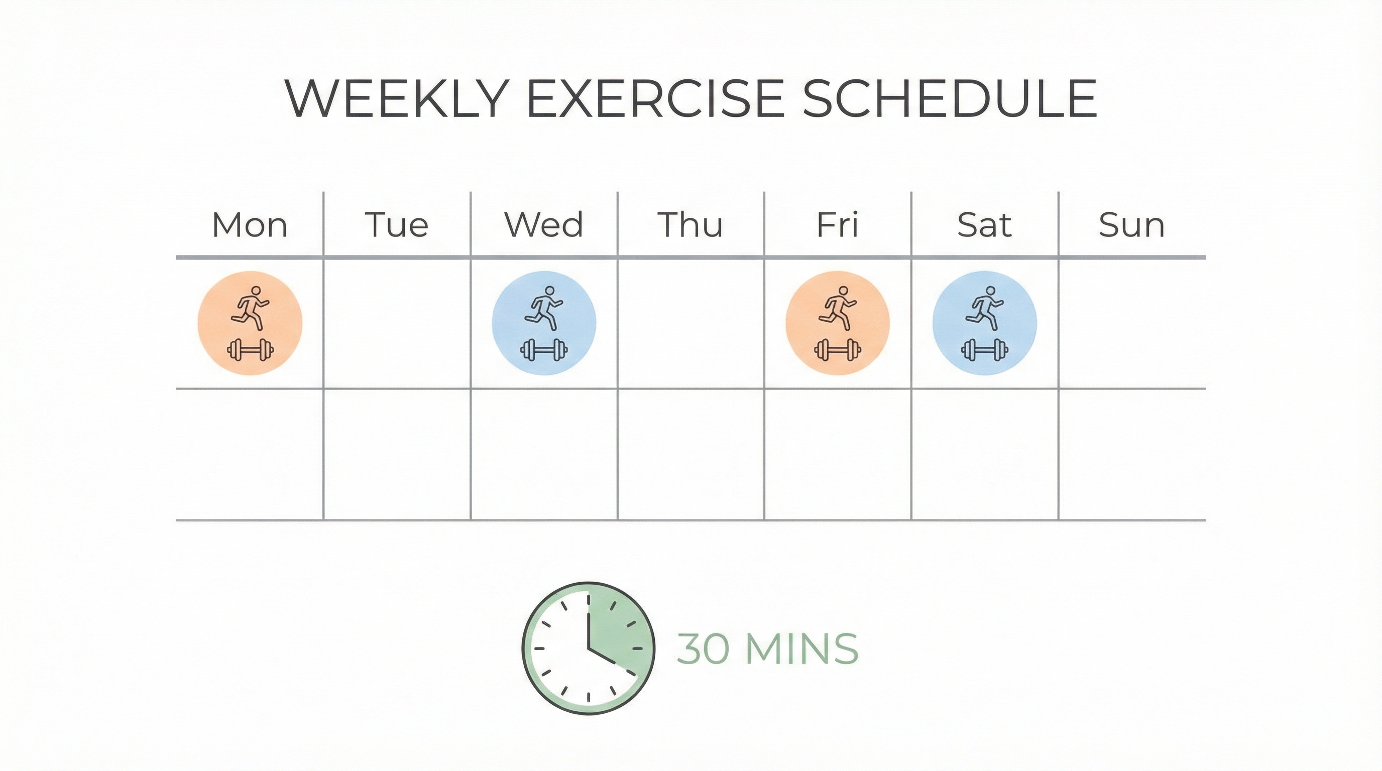 중등도 강도라면 주 5회, 고강도라면 주 3회가 최적입니다. 연구에 따르면 고강도로 주 4회 이상 해도 효과가 크게 증가하지 않으므로, 무리하지 말고 자신에게 맞는 빈도를 선택하세요.