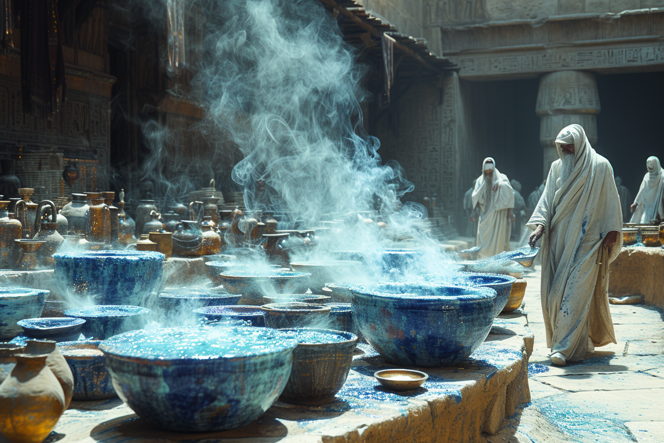 고대 문명에서 파란색은 희귀하고 귀중한 색상으로 여겨졌습니다. 특히 고대 이집트에서는 첫 번째 합성 파란색 안료인 이집트 파란(Egyptian blue)을 만들어 사용했습니다. 이집트 파란은 석회석, 모래, 구리를 혼합하여 고온에서 구워 만들었으며, 이로 인해 파란색은 신성하고 귀중한 색상으로 인식되었습니다.