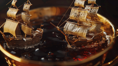 Prompt: Photorealistic closeup video of two pirate ships battling each other as they sail inside a cup of coffee.