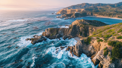 Prompt: Drone view of waves crashing against the rugged cliffs along Big Sur’s garay point beach. The crashing blue waters create white-tipped waves, while the golden light of the setting sun illuminates the rocky shore. A small island with a lighthouse sits in the distance, and green shrubbery covers the cliff’s edge. The steep drop from the road down to the beach is a dramatic feat, with the cliff’s edges jutting out over the sea. This is a view that captures the raw beauty of the coast and the rugged landscape of the Pacific Coast Highway.