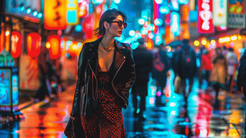 세련된 여성이 화사한 네온사인과 움직이는 도시 간판 사이 도쿄거리를 걷고 있다. 그리곤 여자의 생김새와 행동 프롬프트들.