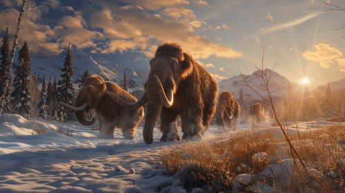 Prompt: Several giant wooly mammoths approach treading through a snowy meadow, their long wooly fur lightly blows in the wind as they walk, snow covered trees and dramatic snow capped mountains in the distance, mid afternoon light with wispy clouds and a sun high in the distance creates a warm glow, the low camera view is stunning capturing the large furry mammal with beautiful photography, depth of field.