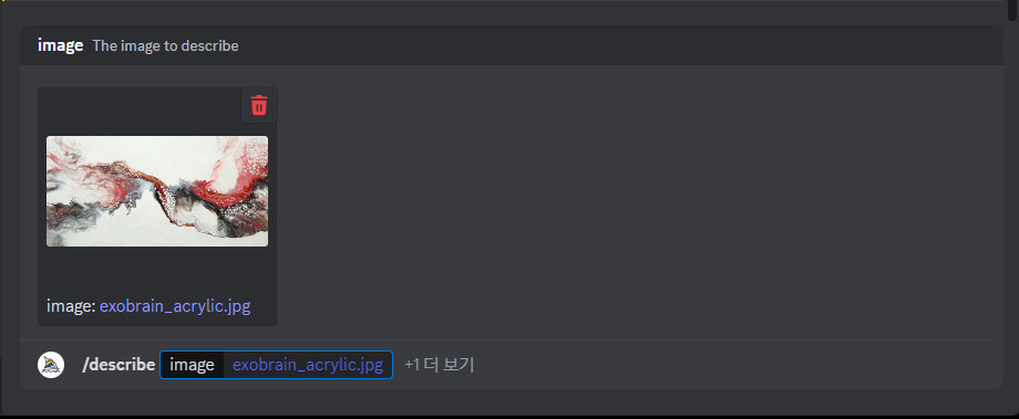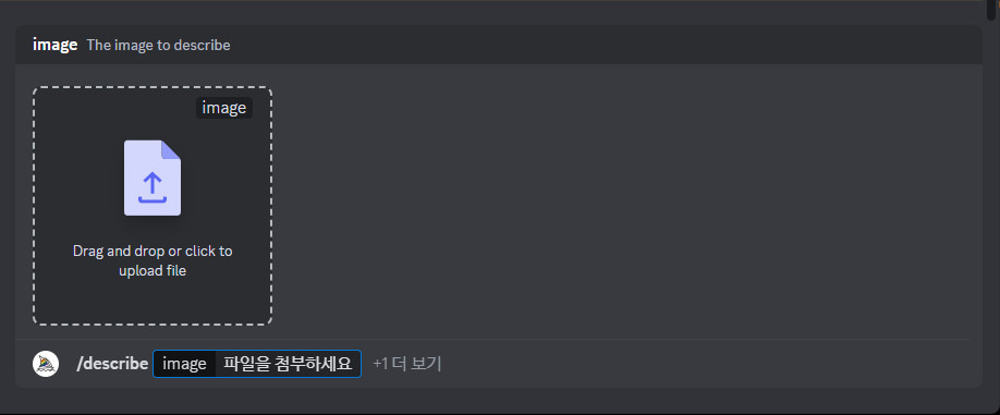 Discord창에서 /describe 입력하고 엔터를 치면 윗그림과 같이 옵션이 2개 나옵니다. 이 기능을 여러번 사용했다면 자동으로 선택할 수 있게 나옵니다.