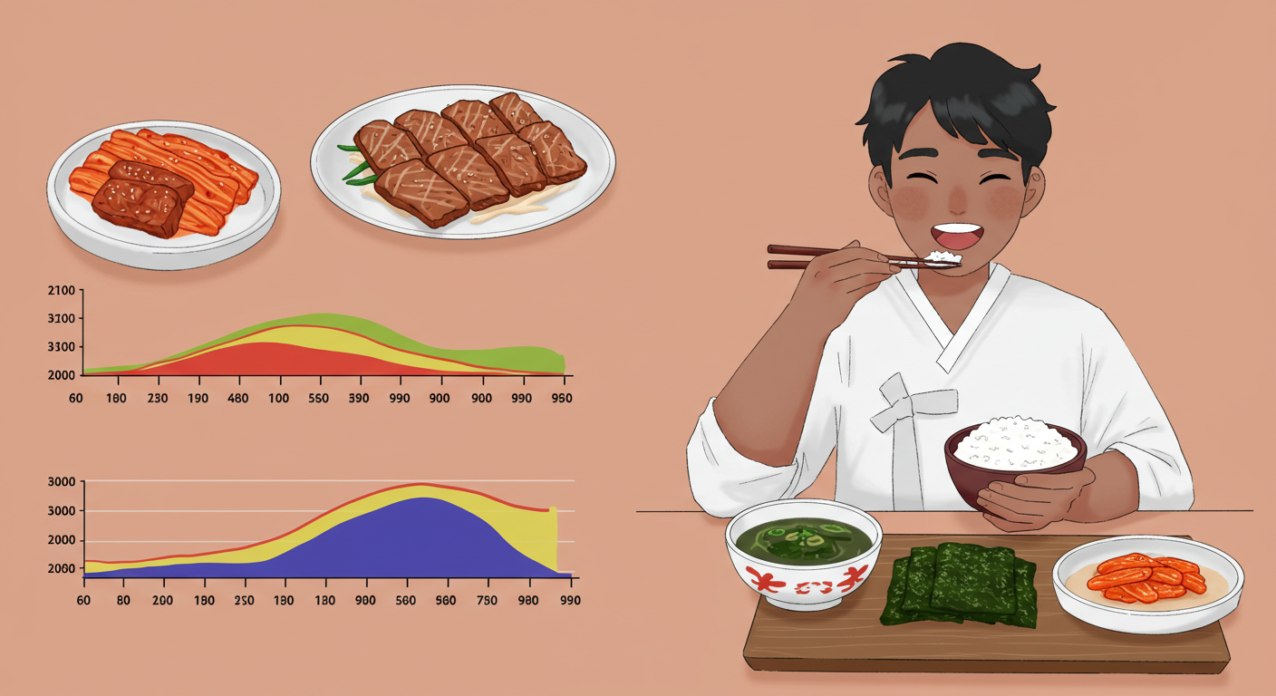 햇반 1개는 약 50g의 탄수화물, 미역국과 김치는 탄수화물이 적습니다. 점심의 총 탄수화물은 약 50~55g입니다. 저녁은 돼지고기(단백질 17g, 지방 15g)가 추가되어 탄수화물은 비슷하지만 소화가 느려집니다.