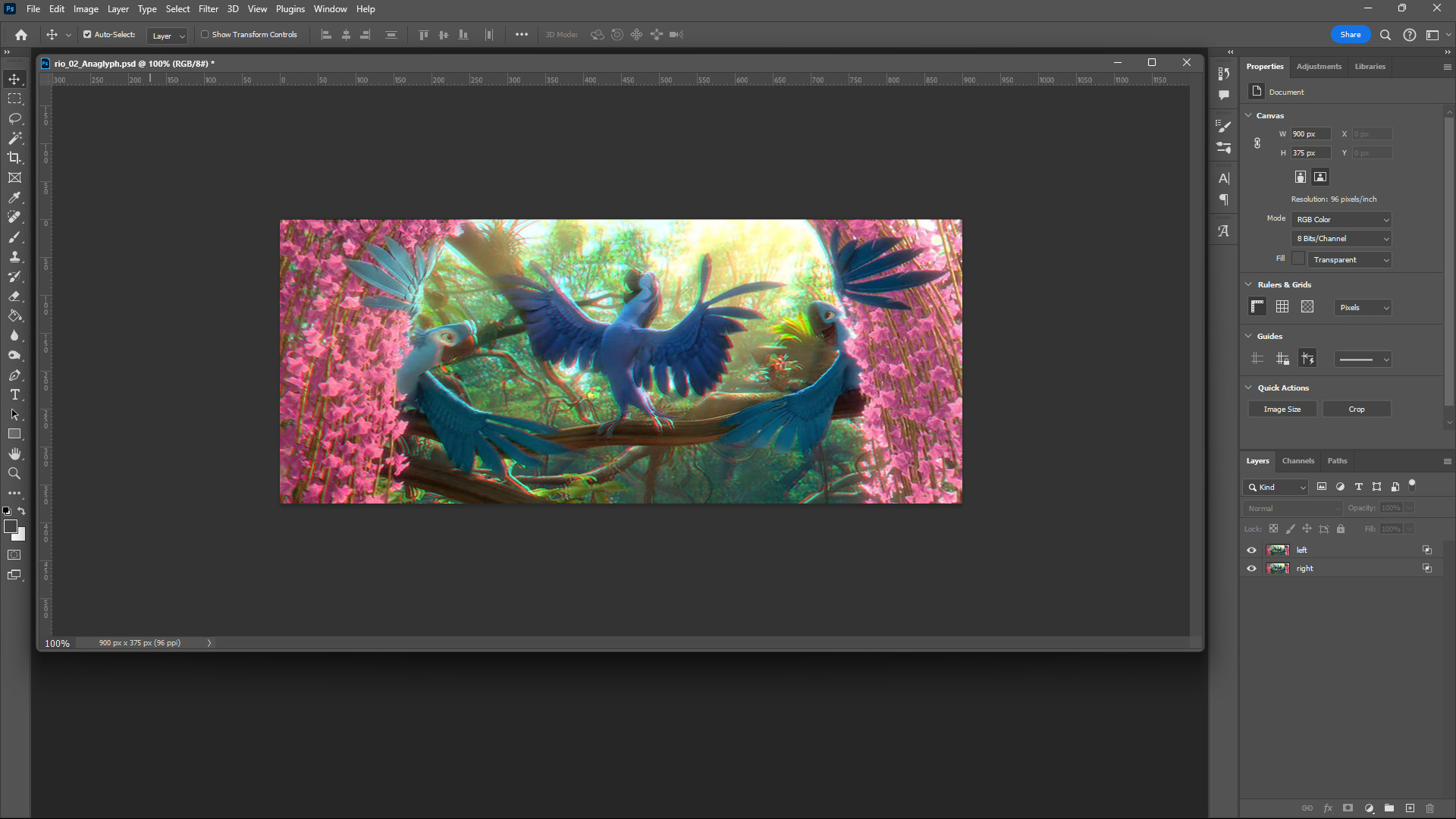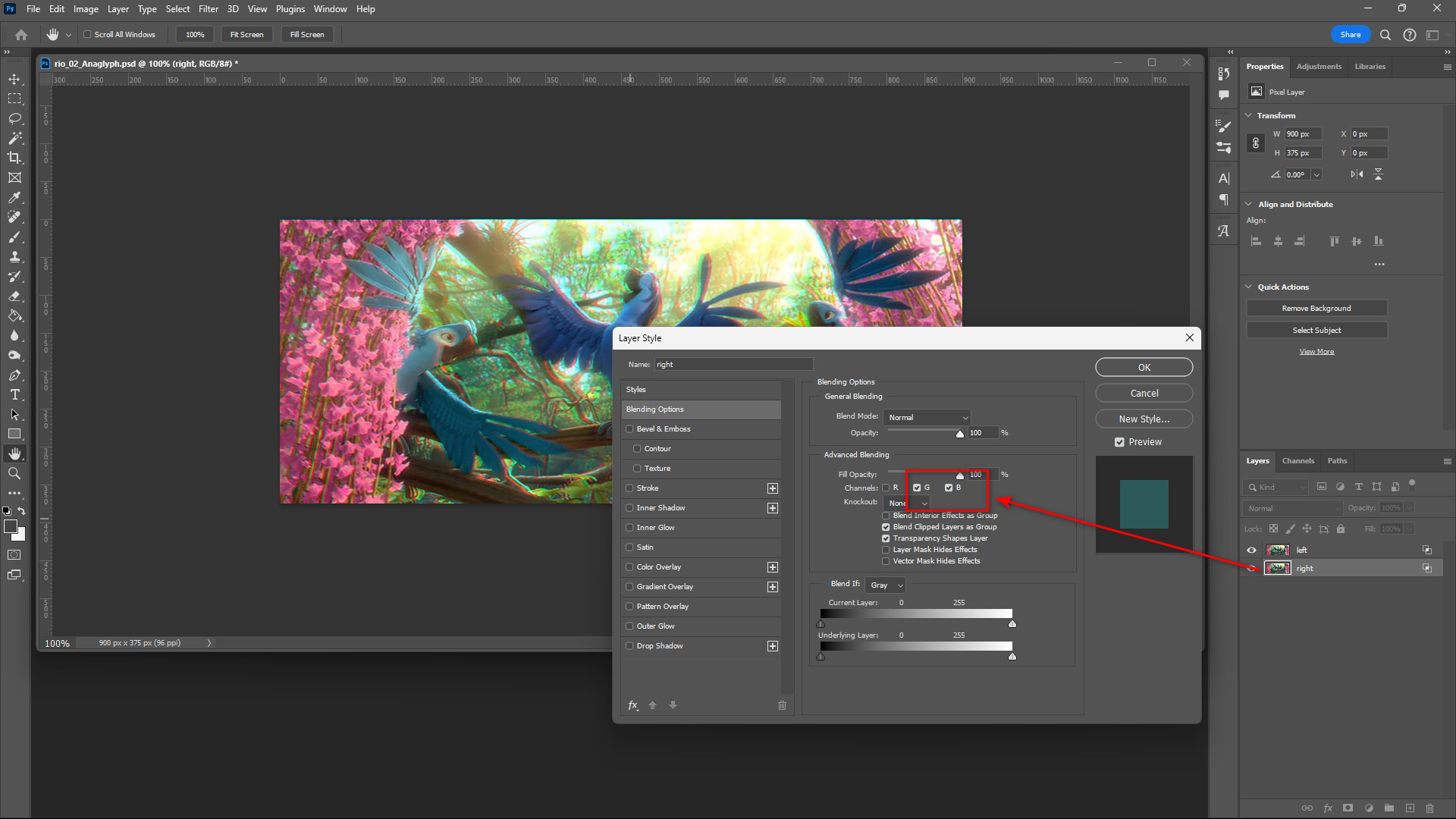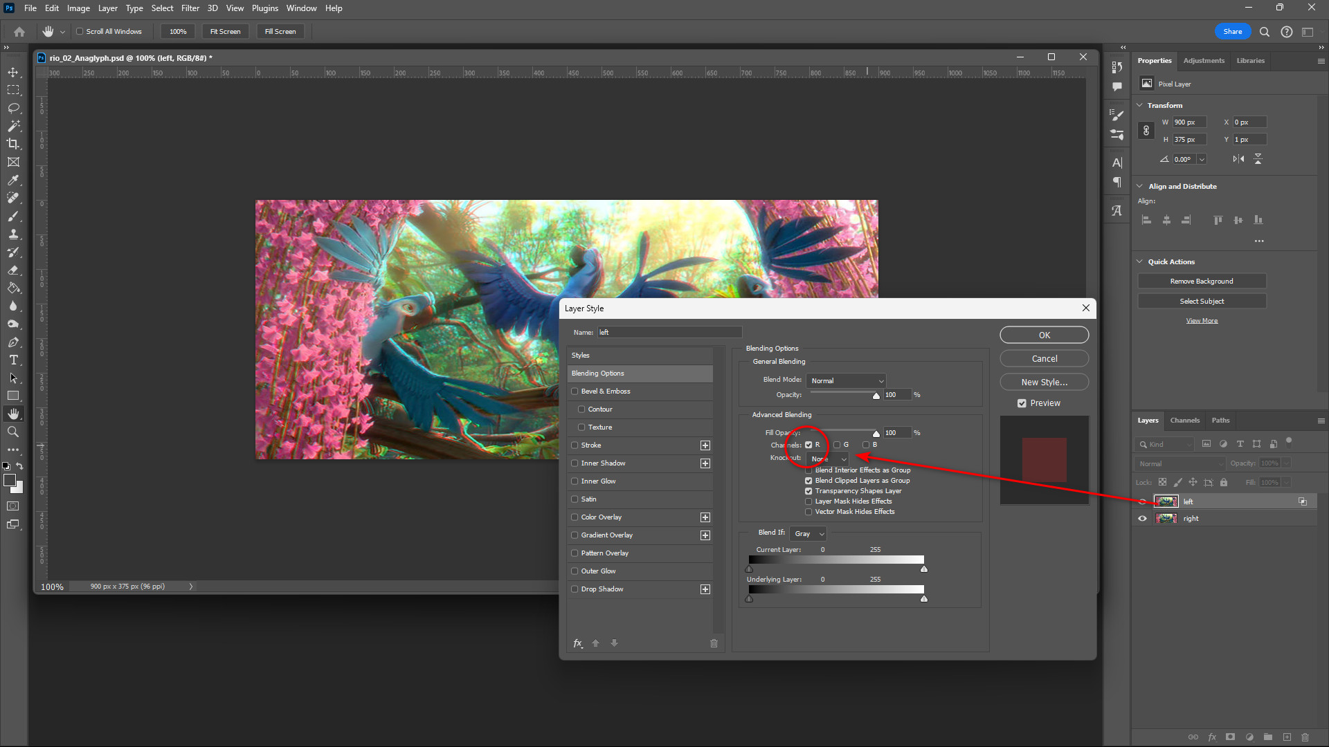 레이어에서 Left만 선택해서 보면 붉은 이미지로 나옵니다. 이때 Right 눈을 꺼야합니다. 그냥 선택만 움직여서는 안나타납니다.