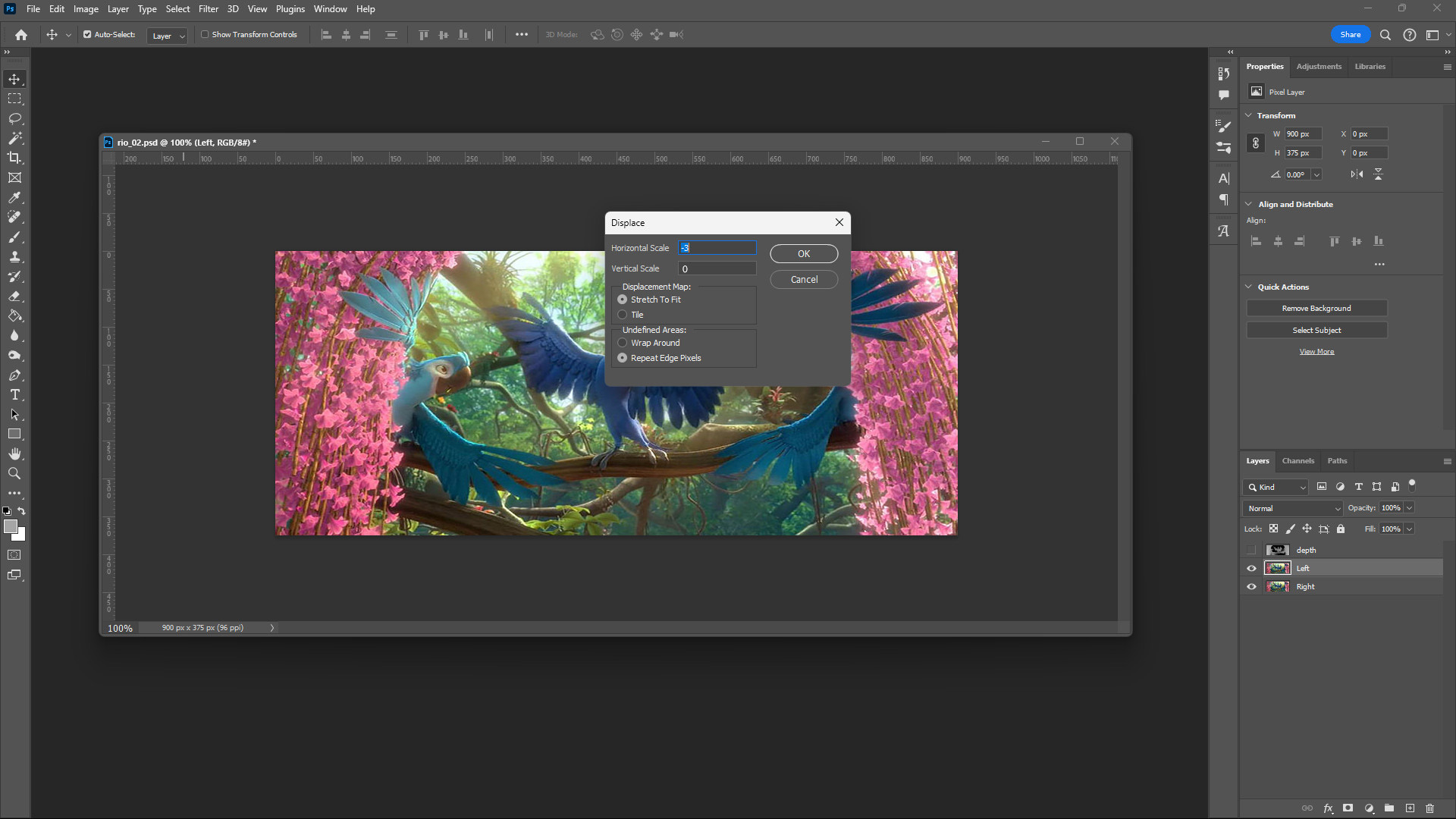 포토샵의 우측 레이어에서는 Left를 선택하고 메뉴중 Filter > Disort > Displace 를 선택합니다.