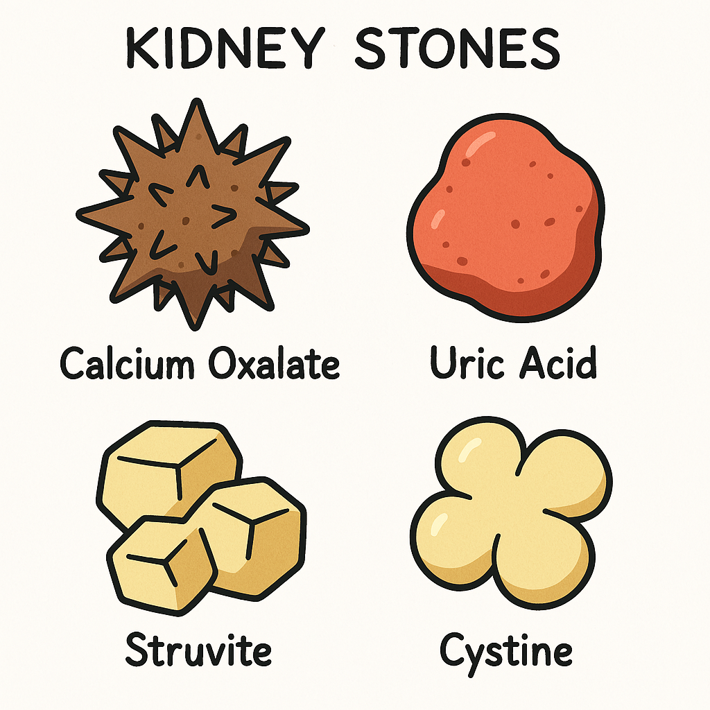 요로결석은 주로 구성 성분에 따라 칼슘 옥살레이트 결석, 요산 결석, 스트루바이트(struvite) 결석, 시스틴(cystine) 결석으로 나뉩니다. 가장 흔한 유형은 칼슘 옥살레이트 결석으로, 전체 요로결석의 약 80%를 차지합니다.3. 요로결석의 발생 빈도