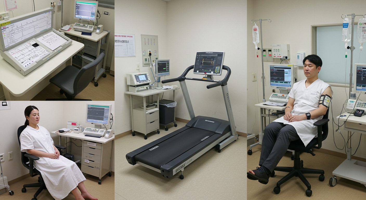 운동부하 심전도 검사는 러닝머신에서 걷거나 뛰면서 심장에 부담을 주어 심전도 변화를 관찰합니다. 협심증, 관상동맥 질환 진단에 유용하며, 약 30분 소요됩니다.