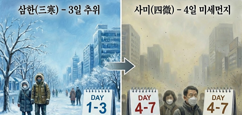 최근에는 삼한사온을 빗대어 '삼한사미'라는 신조어가 등장했습니다. 이는 "3일은 춥고, 4일은 미세먼지가 심하다"는 뜻입니다.