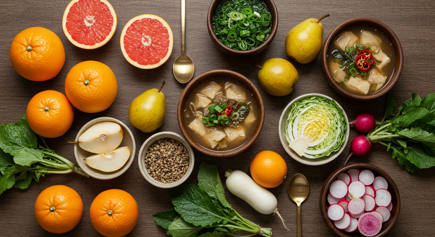 - 배(수분 함량 약 84%): 수분과 식이섬유가 풍부하여 소화 기능 개선에도 도움이 됩니다.